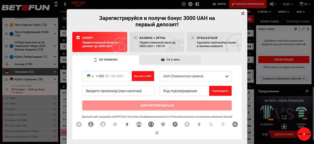 Первый метод регистрации использует мобильный номер в качестве основного идентификатора. На главной странице bet2fun вход начинается с кнопки «Регистрация» в правом верхнем углу. В открывшейся форме выбирается вкладка «Телефон», вводится номер в международном формате с кодом страны. Система автоматически определяет формат ввода. После указания номера выбирается валюта игрового счета — UAH, USD, EUR или RUB. Изменить валюту после создания профиля невозможно.